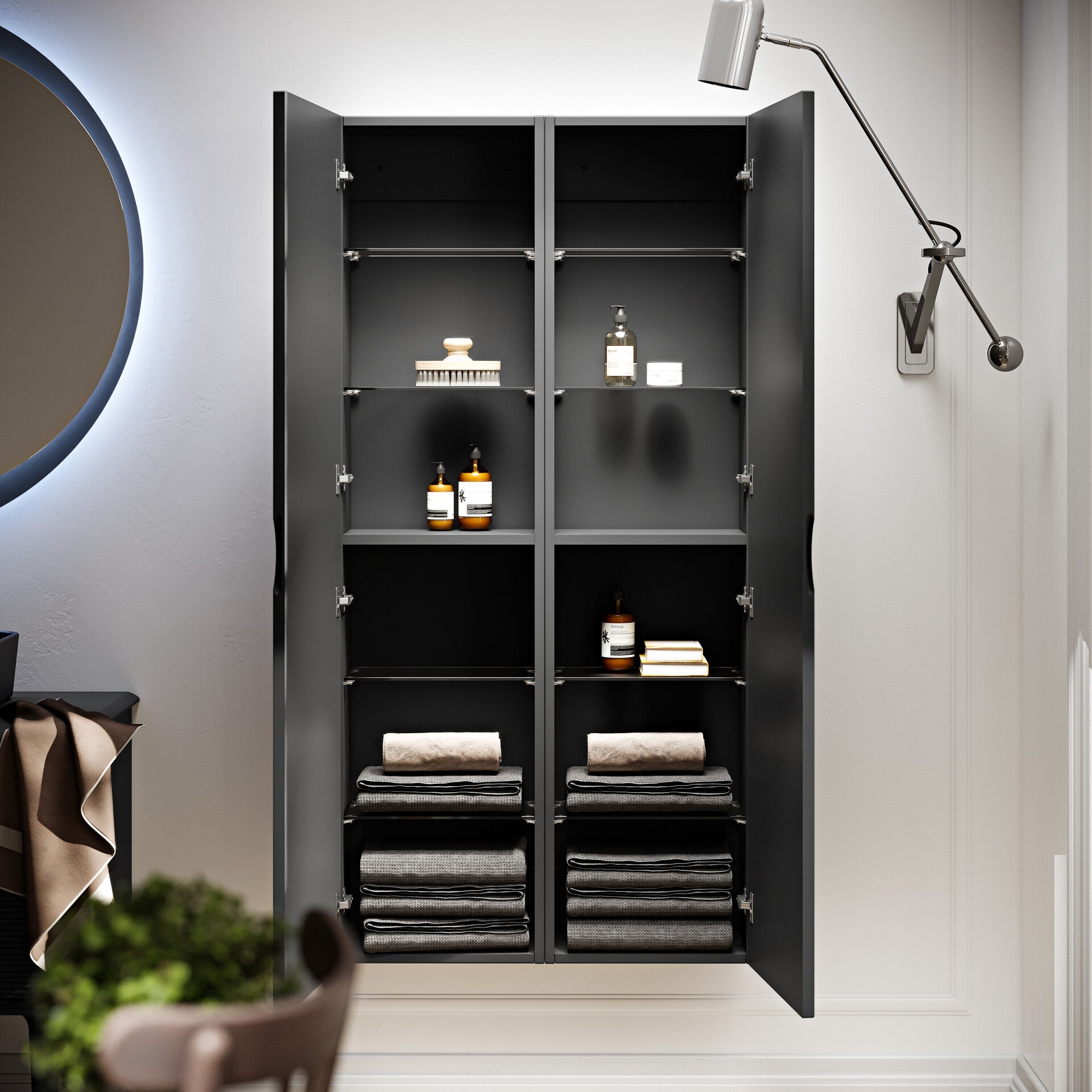 OPTIE: hoge kast in zelfde kleur met glazenplankjes 2 optie 123cm of 140cm